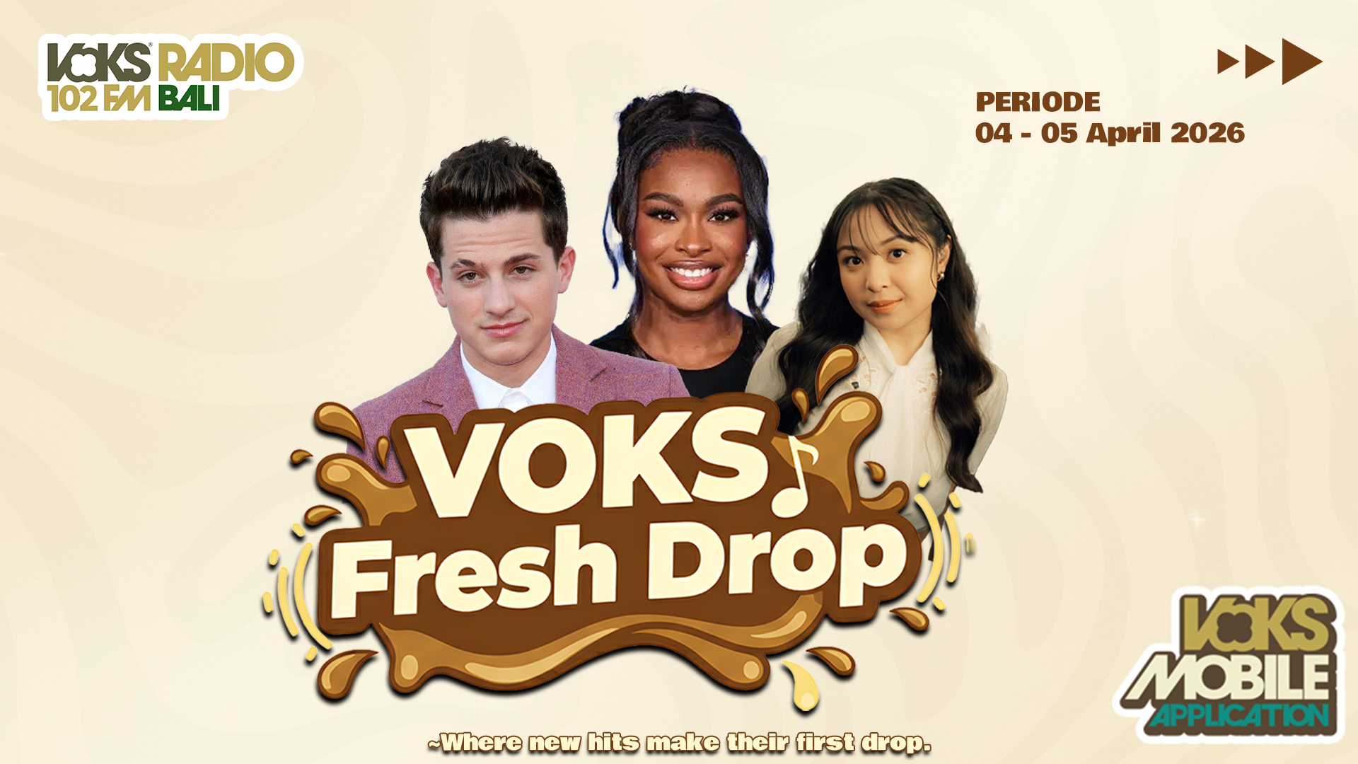 VOKS, Denpasar – Minggu ini VOKS Fresh Drop 102 FM kembali menghadirkan rilisan musik yang fresh dengan beragam warna, mulai dari nuansa R&B modern yang smooth hingga pop Indonesia yang hangat dan penuh perasaan. Kolaborasi antara Charlie Puth dan Coco Jones lewat single “Sideways”, serta lagu terbaru dari Bernadya berjudul “Kita Buat Menyenangkan”, sama-sama berhasil jadi new entry yang mencuri perhatian di Bali Top Hitz dan Poster Indonesia.